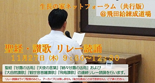 生長の家本部練成道場では、「生長の家ネットフォーラム(共行版)」として、11月27日9時30分より、道場の本部講師(補)によります聖経・讃歌のリレー読誦を行い、その模様をFacebookページにてライブ配信いたします。