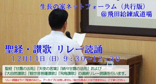 生長の家本部練成道場では、「生長の家ネットフォーラム(共行版)」として、12月14日9時30分より、道場の本部講師(補)によります聖経・讃歌のリレー読誦を行い、その模様をFacebookページにてライブ配信いたします。